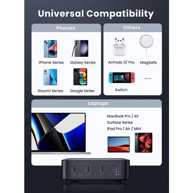 • More Ports, More Freedom: Get more done with all your devices within arm's reach. Charge up to 4 devices simultaneously, managing the wired mess and saving desktop space. Compatible with MacBook Pro, MacBook Air, Dell XPS, iPhone 14/13/12 series, Galaxy S23/S22 series, iPad, Steam Deck, and more!
