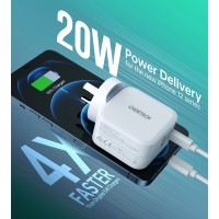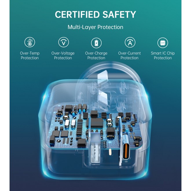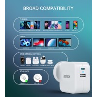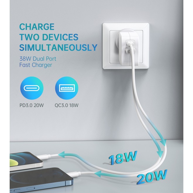 • Two-in-one: USB-C 20W PD3.0 Port and a USB-A 18W QC3.0 port, total 38W will charge two of your devices simultaneously