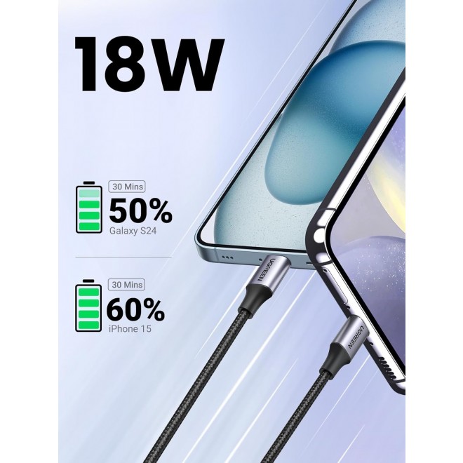 • QC 3.0 Fast Charge Supported: UGREEN USB C Cable supports QC/AFC/FCP/BC1.2 fast charging protocol with 18W (3A) output, which enables it to charge Qualcomm Quick Charge supported phones at full speed. It charges an iPhone 15 to 60% in 30 minutes, an Galaxy S24 to 50% in 30 minutes. Note: This UGREEN USB type C Cable won't provide fast charging on its own, please make sure your phone and charger all support fast charging.